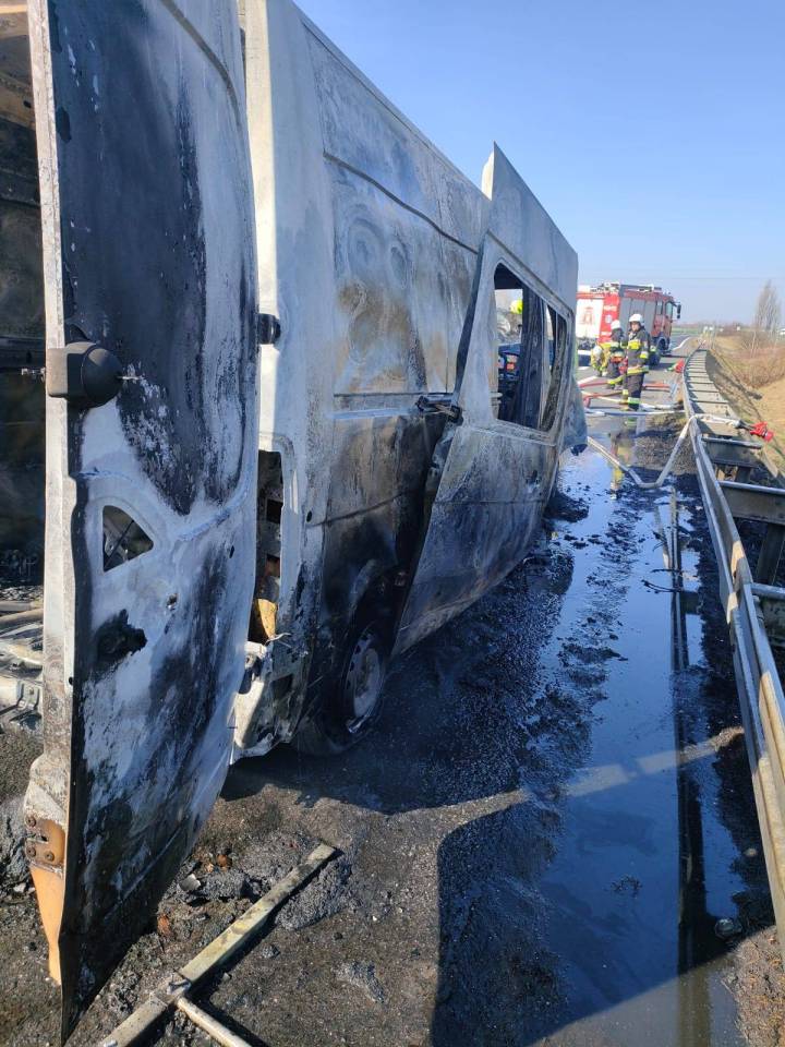 - Po przyjeździe na miejsce strażaków pojazd był całkowicie objęty pożarem i znajdował się na pasie awaryjnym autostrady. W wyniku pożaru nie został nikt poszkodowany. Podczas prowadzonych działań gaśniczych przez przybyłych na miejsce strażaków ruch drogowy na autostradzie w kierunku Poznania był wstrzymany - informuje bryg. Radosław Ogrodowczyk z KP PSP w Poddębicach. - Busem podróżował sam kierowca, a prawdopodobną przyczyną zdarzenia było zwarcie instalacji elektrycznej w pojeździe.