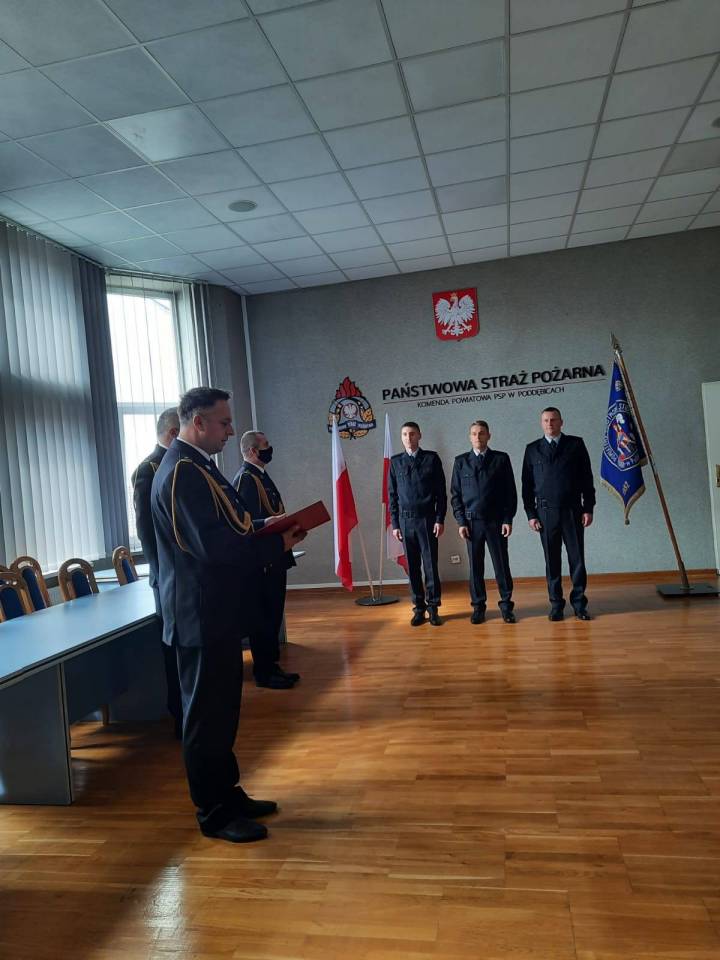 Dwóch z nich to absolwenci Centralnej Szkoły PSP skierowani do służby przez Komendanta Głównego. Pozostali trzej zostali wyłonieni w drodze naboru i w dniu wczorajszym złożyli ślubowanie. Po wypowiedzeniu słów roty zaprzysiężeni funkcjonariusze otrzymali akty ślubowania oraz akty nadania stopnia służbowego.