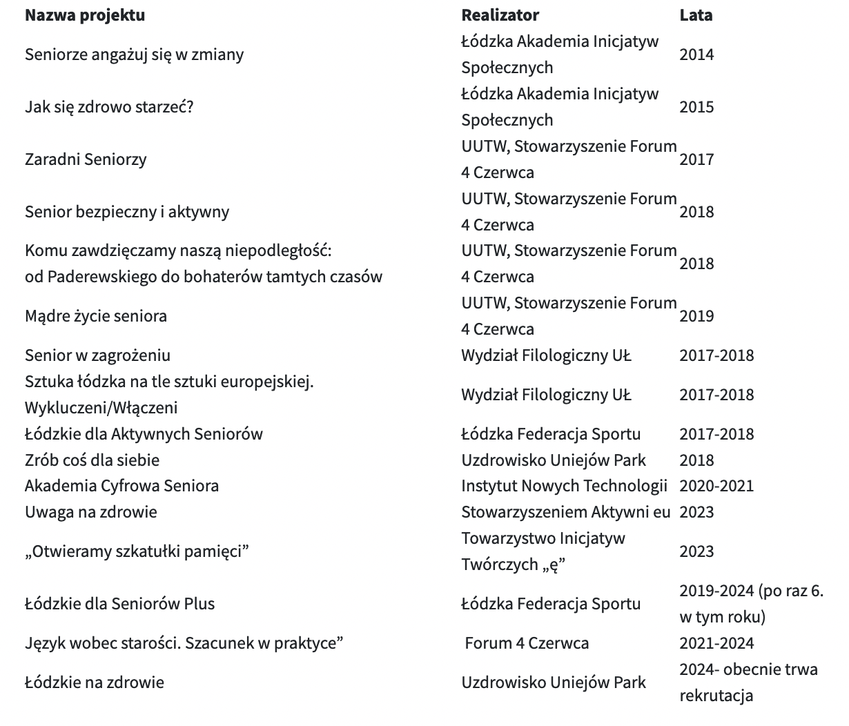 Rozpropagowano wśród słuchaczy Kartę Seniora Województwa Łódzkiego i służono pomocą 147 seniorom w jej uzyskaniu. Rozpowszechniono też Kopertę Życia, która umieszczona w widocznym miejscu w lodówce może ułatwić ratownikom medycznym szybką i skuteczną pomoc.