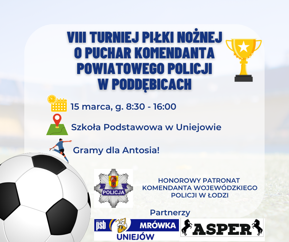 Serdecznie zapraszamy wszystkich mieszkańców i miłośników piłki nożnej do udziału w tym wyjątkowym wydarzeniu. To doskonała okazja, by wspólnie spędzić czas, zobaczyć w akcji policjantów z różnych jednostek i przede wszystkim okazać serce, wspierając Antosia. Aby obejrzeć emocjonujące mecze i dopingować zawodników, wystarczy wrzucić symboliczną kwotę do puszki. Cały dochód z turnieju zostanie przeznaczony dla pomoc dla Antosia.Niech ta sportowa rywalizacja będzie okazją do jednoczenia się dla szczytnego celu – zachęca do udziału w wydarzeniu mł. asp. Alicja Bartczak.
