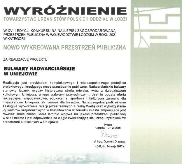 Towarzystwo Urbanistów Polskich o. Łódź po raz siedemnasty wybrało najlepsze przestrzenie publiczne w województwie łódzkim w 2021 r. Jury konkursu wyróżniło uniejowskie bulwary nadwarciańskie w kategorii: nowo wykreowana przestrzeń publiczna.