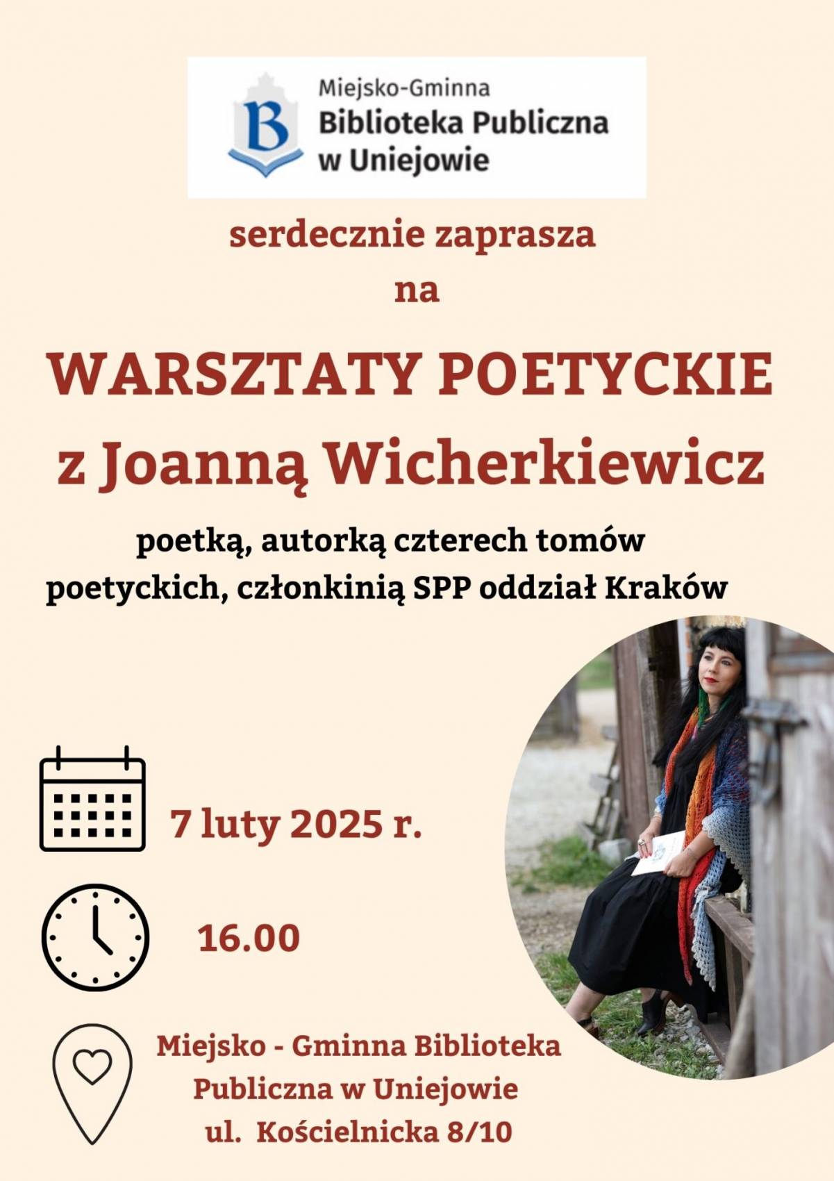 Miejsko-Gminna Biblioteka Publiczna w Uniejowie serdecznie zaprasza na warsztaty poetyckie z Joanną Wicherkiewicz, poetką, autorką czterech tomów poetyckich, członkinią SPP oddział Kraków.
